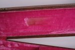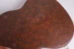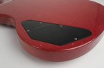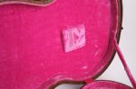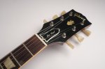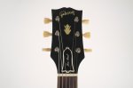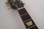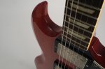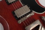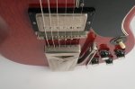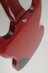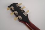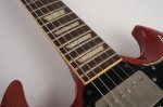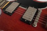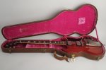 The guitar’s cherry finish appears to be original and shows signs of typical deterioration with lacquer checking, small dents, surface scratches, and mild sun-fading of the original color. This particular model has a factory applied head stock “stinger” with no evidence of any breakage concealed on or near the headstock. There is some discoloration of the inlays around the edge.