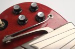 The truss rod cover, control knobs, bridge, pickup cover, pickup rings, pick guard, and vibrola all look to be original and in proper functioning order. The original double-ring/single line Deluxe Kluson tuners are in great shape and have the correct patent number stamp inside the tuner casing.