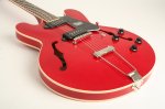 This fully hollow, double cutaway is the lightest guitar in our lineup. Constructed using the same laminate maple rim set as our H-535 model, the open construction and lack of a full center block, allows this guitar to breathe naturally. The addition of a set of Lollar P-90s, provides warm and growling tones that many players seeking a vintage tone desire.